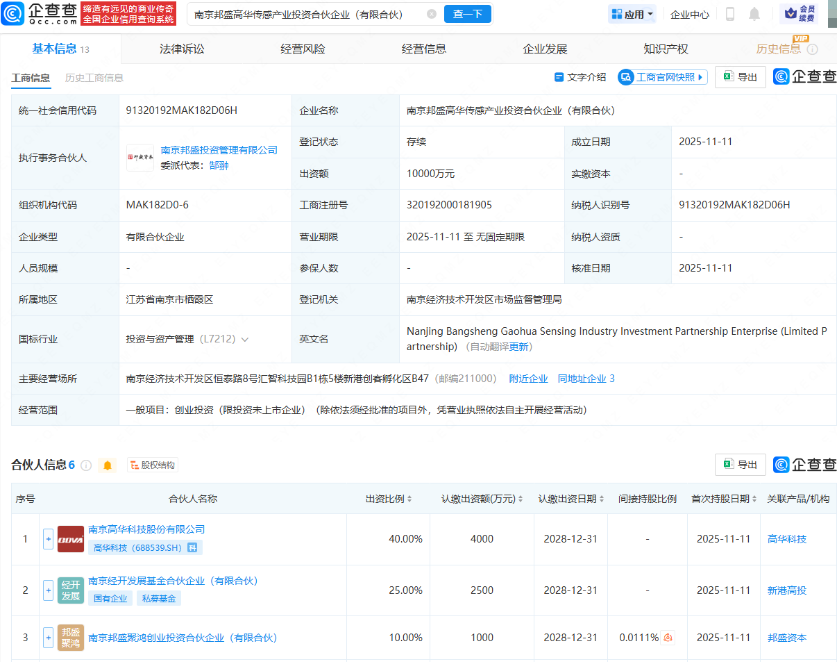 近日,南京邦盛高华传感产业投资合伙企业(有限合伙)成立,出资额1亿元,经营范围为创业投资(限投资未上市企业)。企查查股权穿透显示红腾网配资,该合伙企业由高华科技(688539)、南京经开发展基金合伙企业(有限合伙)等共同持股。