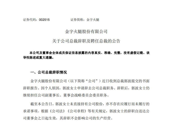 12月15日,金字火腿发布公告称,总裁郭波因个人原因辞职,辞职后仍担任副董事长及董事会战略委员会委员职务。郭波辞职自送达董事会之日起生效,且未持有金字火腿股份,也不存在未履行的承诺事项。